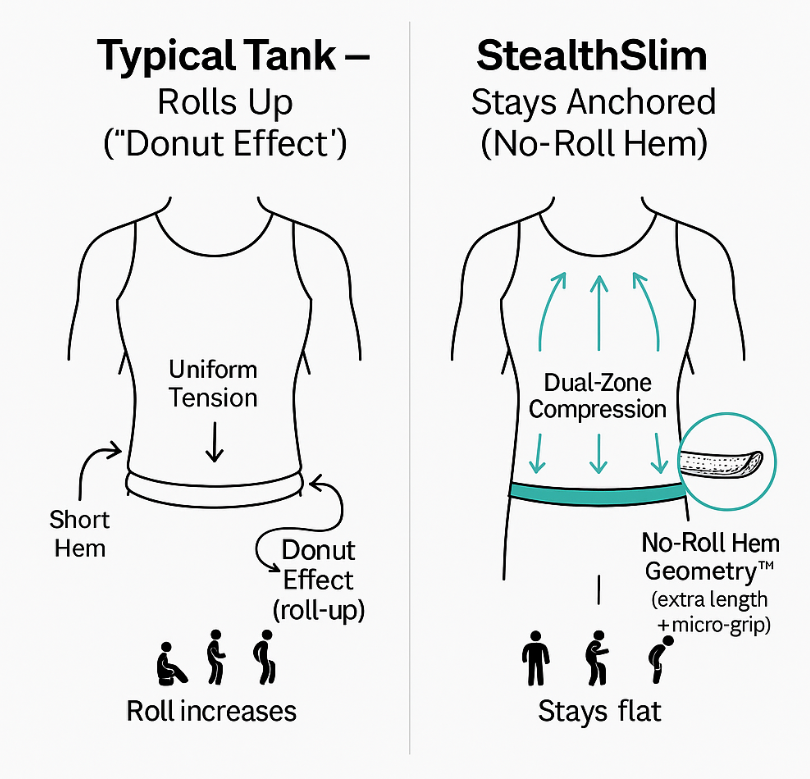 The #1 complaint about compression tanks? They roll up into a 'donut' by noon. StealthSlim's No-Roll Hem Geometry™ features extra length and micro-grip technology that keeps it anchored all day—no matter how much you move. Finally, compression that stays where you put it